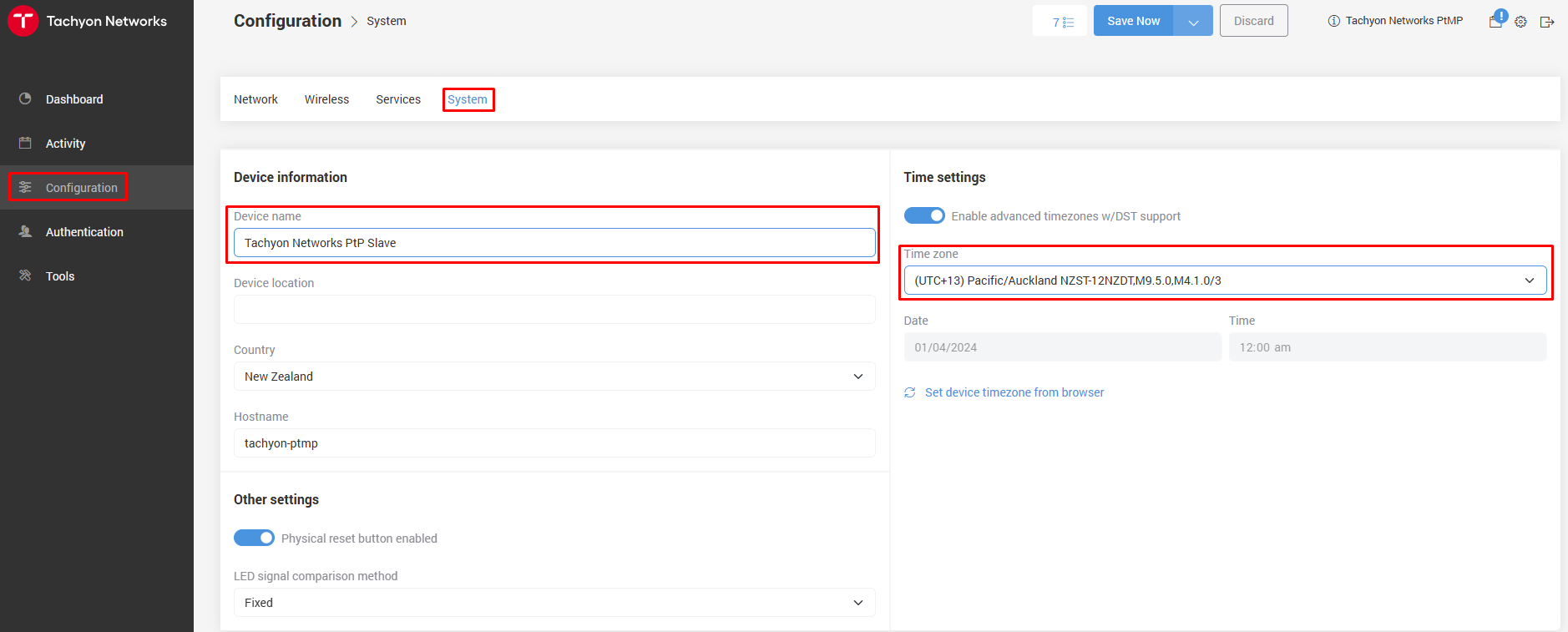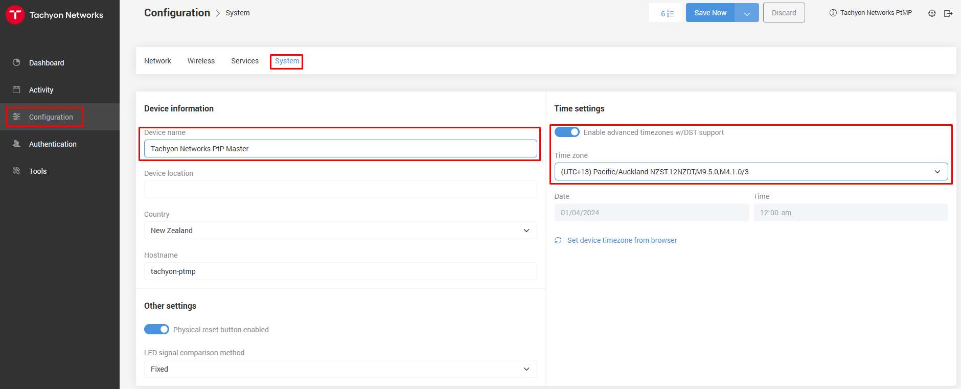 3. Next go to the System page and set a unique Device name to identify the Master radio, we would also recommend configuring the Time settings for accurate logging: